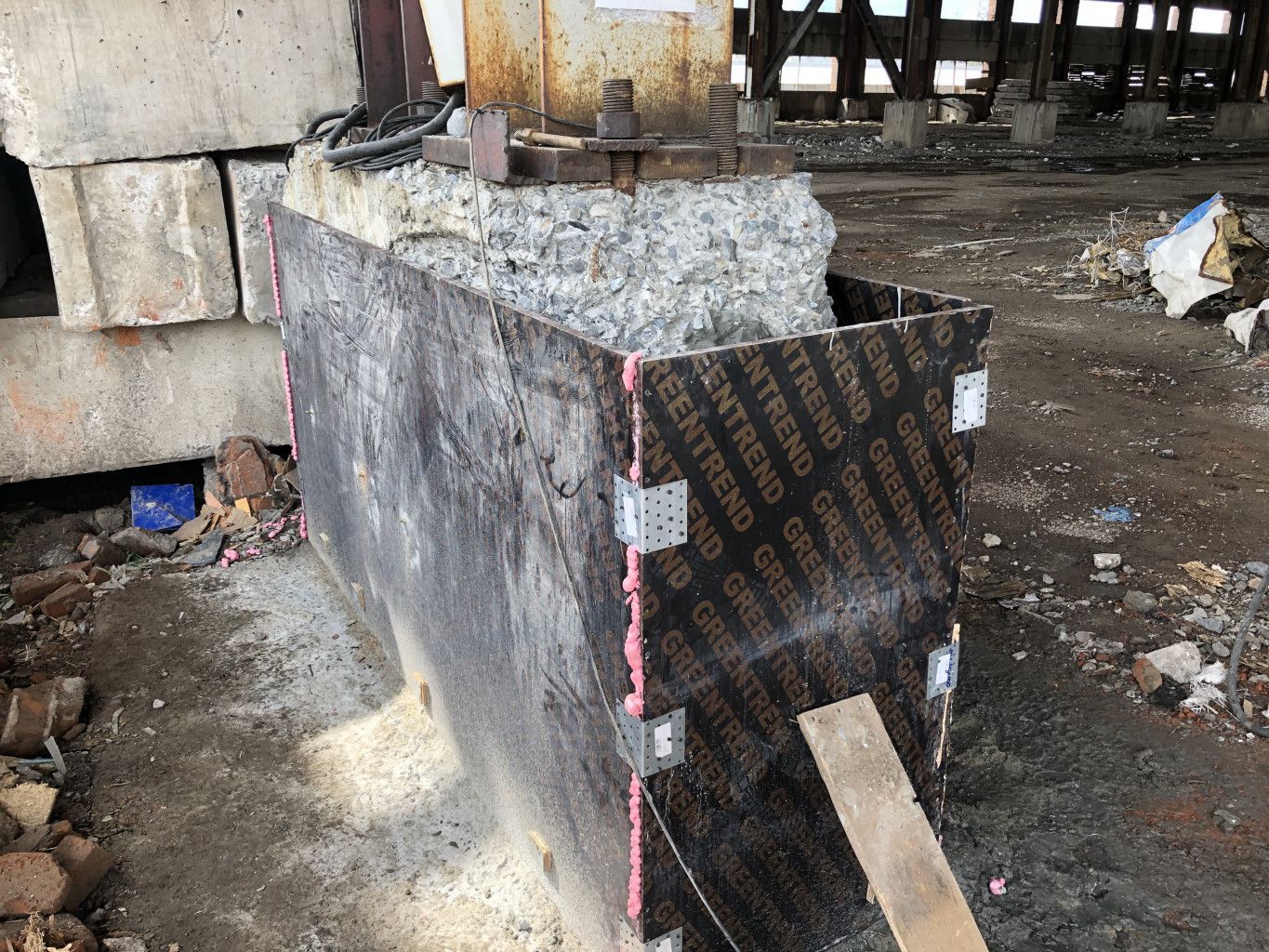 Сооружение было возведено в начале девяностых годов, но небыло достроено. Оно планировалось как теплое производственное помещение для производственных нужд. Из-за остановки строительства тридцать лет назад, возведенной конструкции пришлось пережить сотни циклов заморозки-разморозки, открытого природного воздействия в виде снега, дождя, и ультрафиолета с ветрами. Именно эти воздействия повлекли за собой коррозию бетонных и металлических строительных элементов. Наша компания как опытный участник строительной отрасли г. Новосибирска, и в частности профессионал в работе с усилением бетона, и использовании материала Скрепа М600 приступила к доработке проекта с заказчиком, и выполнению непосредственно подранных работ по усилению бетона, и восстановлению геомиетрии ростверков.